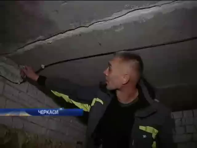 У центрi Черкас розсипаeться будинок, зданий в експлуатацiю всього 15 рокiв тому. Понад 70 сiмей можуть опинитися пiд завалами. За будiвельними нормативами ця висотка не так вже й стара. Величезнi трiщини пiшли по стiнах - вiд фундаменту - до самого даху. Мешканцi засинають i прокидаються пiд трiск стiн.